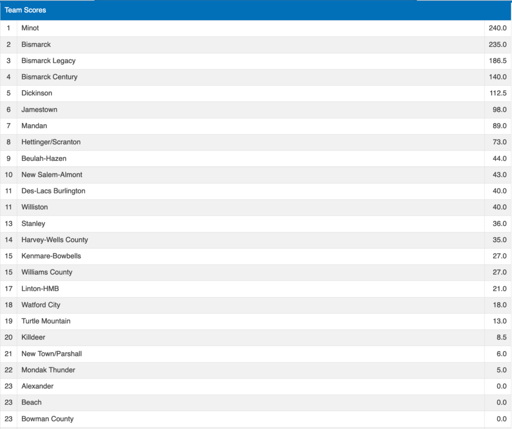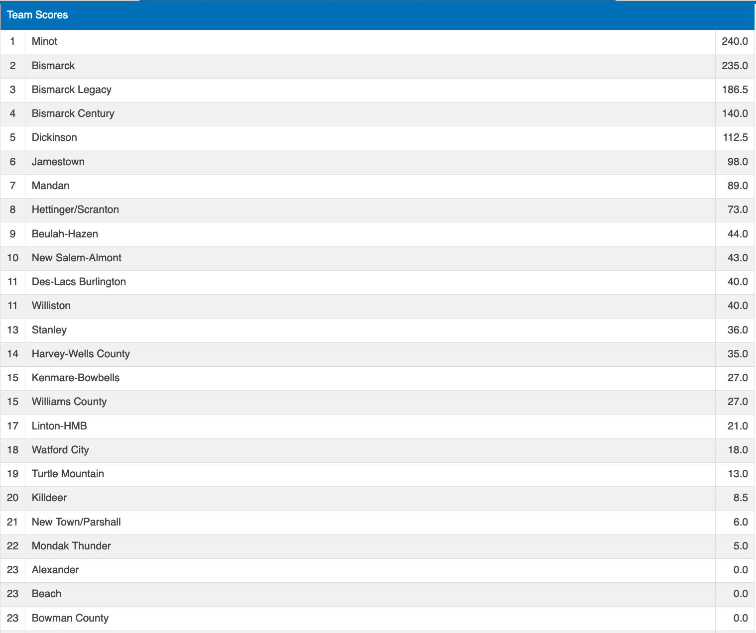 Minot wins the West Girls Region behind it’s 5 finalist and 3 champions.  Champions include 118 Hallie Nash (Minot) 32-11, Jr. over Keisha Tomac (New Salem-Almont) 21-7, So. (Fall 4:53), 124 Madisyn Racine (Minot) 35-9, 7th. over Amaya Baptiste (Kenmare-Bowbells) 26-2, 7th. (Dec 7-6), and 155 Kiera Aguilar (Minot) 32-5, Jr. over Lexi Beckler (Bismarck) 24-12, Sr. (Fall 2:50)