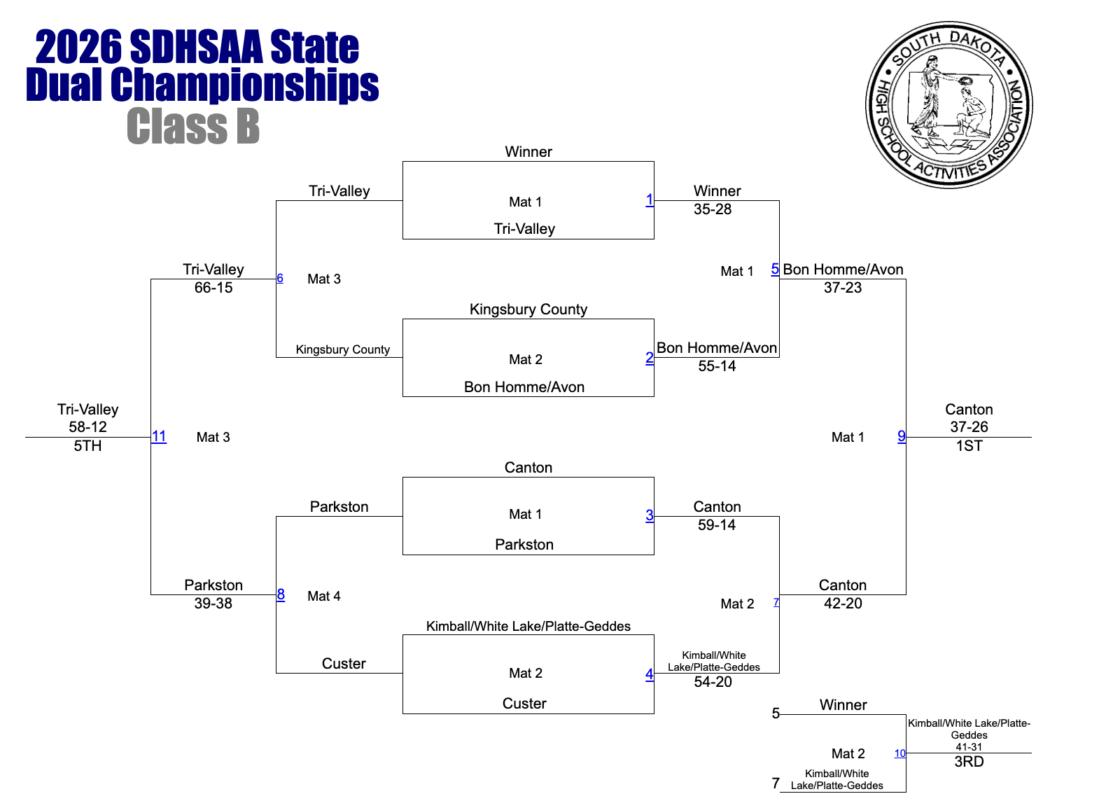 - 120 – Michael Branaugh (Bon Homme/Avon) over Chase Henriksen (Kingsbury County) Dec 3-1