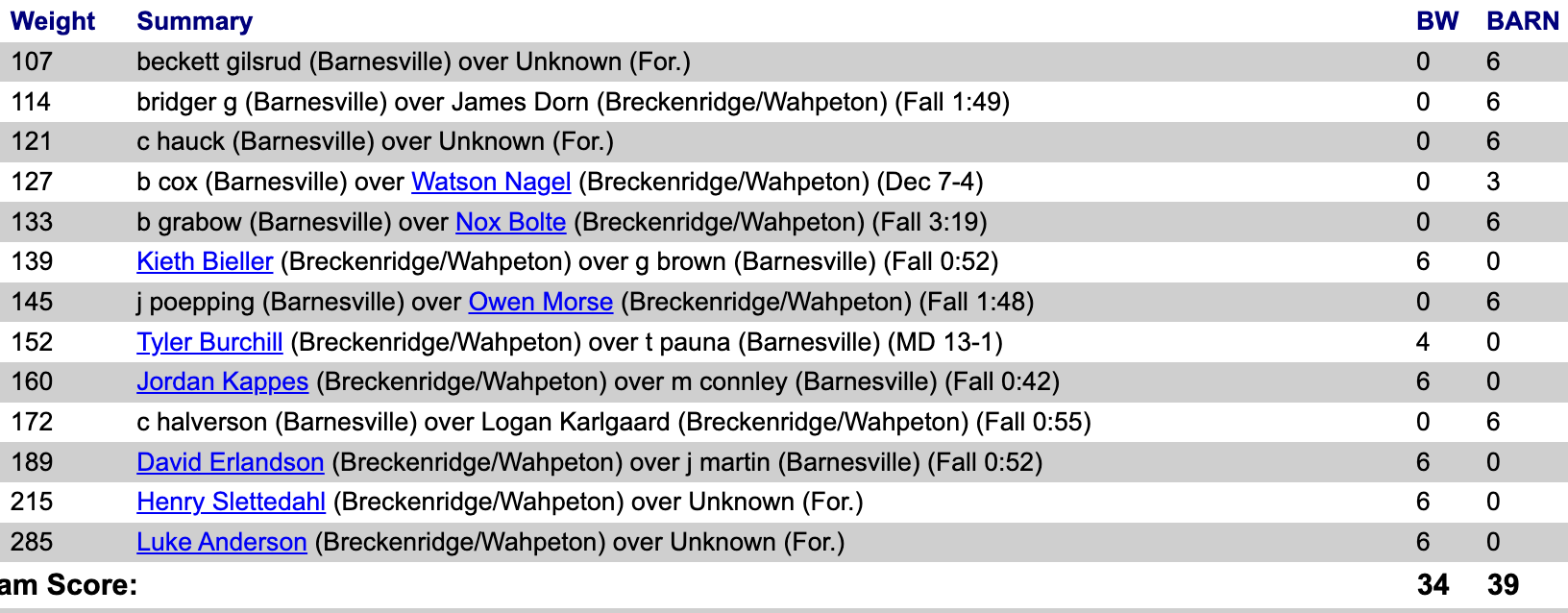 Barnesville, Fargo Davies @ Wahpeton. Barn 39 BW 34 FD 71 BW 0 FD 42 Barn 30