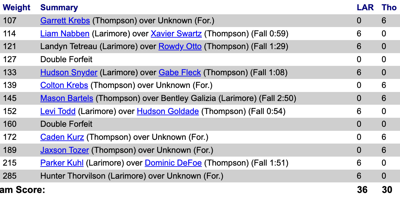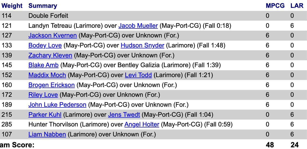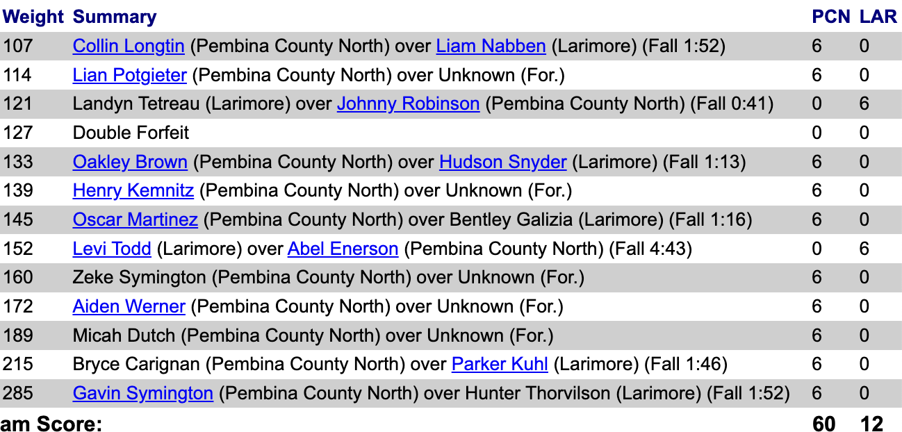 Larimore, Pembina County North, Thompson @ Mayville-Portland MPCG 48 Lari 24, PCN 60 Lari 12, Lari 36 Thom 30, PCN 64 MPCG 11, Thom 39 MPCG 34, PCN 53 Thom 18
