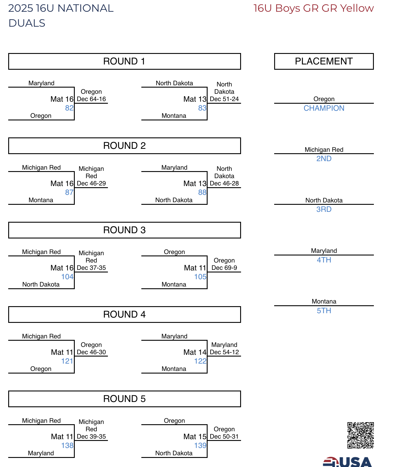 | 88 | Aiden Rosewarne, CA over Forfeit, ND (FF ) | 0 | 5 |