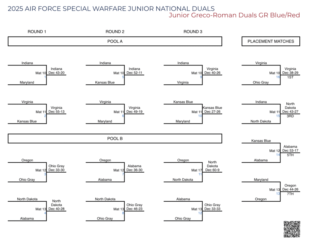 | 132 | Benjamin DeForest, ND over Trey Denny, AL (TF 8-0 (2:35) ) | 4 | 0 |