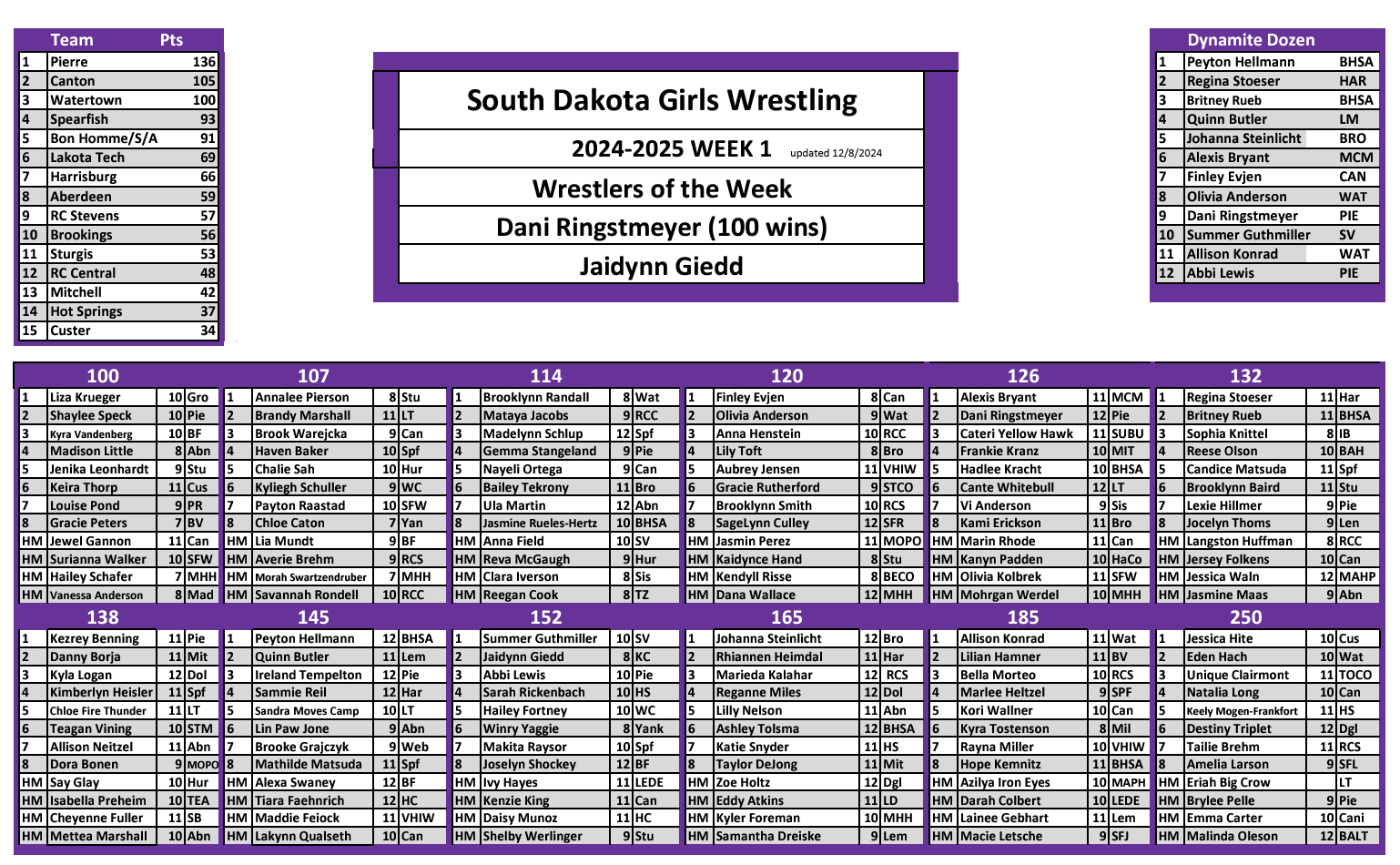 Well here is Week 1 Girls ratings. Hopefully we caught everything, as there are a ton of moving pieces the first few weeks. If we missed something please bear with us as this will all definetly change as we go! WHAT A FIRST WEEK OF WRESTLING!! The numbers of girls out this year is super exciting to see!! Congratulation to the WOW as Dani Ringstmeyer reached 100 wins and Jaidynn Giedd had a nice win. Week 2 here we come!