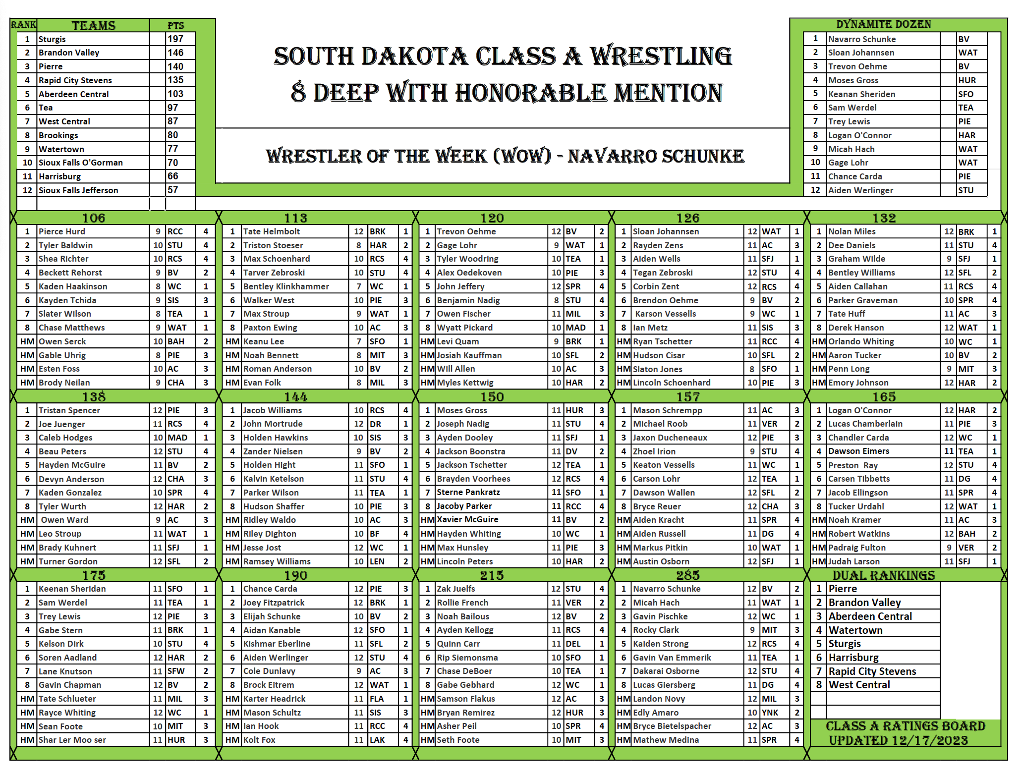 <a href="https://www.dakotagrappler.com/wp-content/uploads/2023/12/SD-Class-A-Week-3-2023-2024.pdf">SD Class A Week-3-2023-2024</a> <a href="https://www.dakotagrappler.com/wp-content/uploads/2023/12/Screenshot-2023-12-18-at-11.41.58 AM.png"><img class="[ftmt_id] alignnone wp-image-6788 size-large" src="https://www.dakotagrappler.com/wp-content/uploads/2023/12/Screenshot-2023-12-18-at-11.41.58 AM-1024x778.png" alt="" width="1024" height="778" /></a> <a href="https://www.dakotagrappler.com/wp-content/uploads/2023/12/SD-B-Week-3-Ratings-23-24.pdf">SD B Week-3-Ratings-23-24</a> <a href="https://www.dakotagrappler.com/wp-content/uploads/2023/12/Screenshot-2023-12-18-at-11.42.51 AM.png"><img class="[ftmt_id] alignnone wp-image-6789 size-large" src="https://www.dakotagrappler.com/wp-content/uploads/2023/12/Screenshot-2023-12-18-at-11.42.51 AM-1024x769.png" alt="" width="1024" height="769" /></a> <a href="https://www.dakotagrappler.com/wp-content/uploads/2023/12/SD-Girls-ranking-23-24-week-3.pdf">SD Girls ranking-23-24-week-3</a> <a href="https://www.dakotagrappler.com/wp-content/uploads/2023/12/Screenshot-2023-12-18-at-11.40.21 AM.png"><img class="[ftmt_id] alignnone wp-image-6786 size-large" src="https://www.dakotagrappler.com/wp-content/uploads/2023/12/Screenshot-2023-12-18-at-11.40.21 AM-1024x652.png" alt="" width="1024" height="652" /></a>