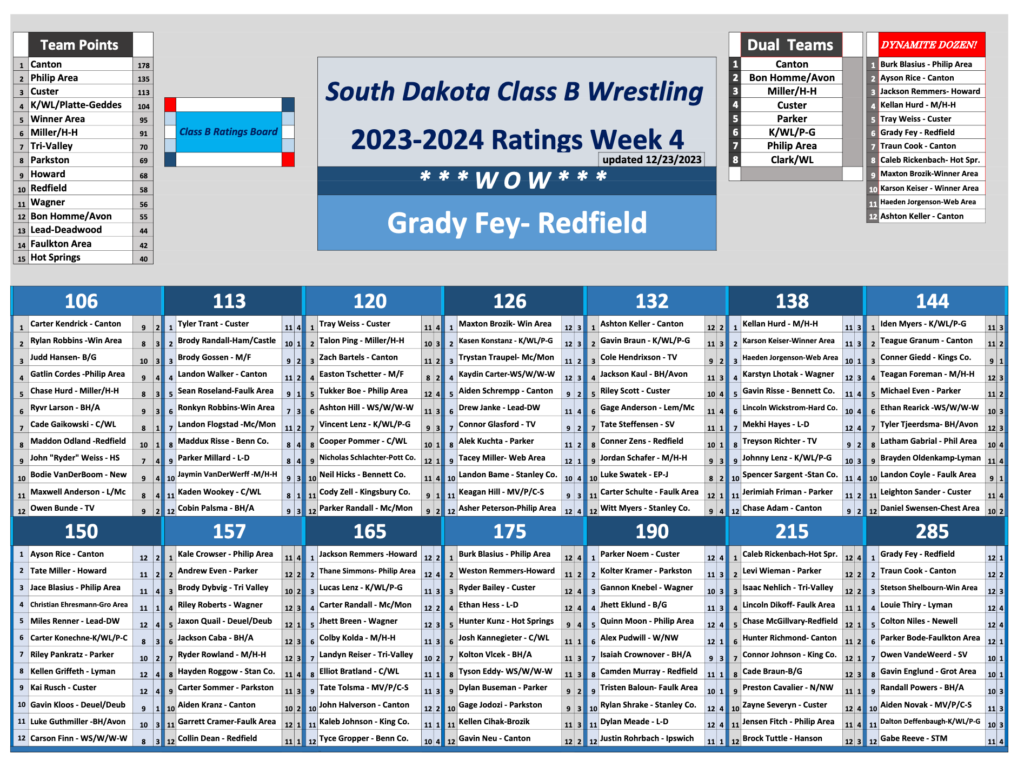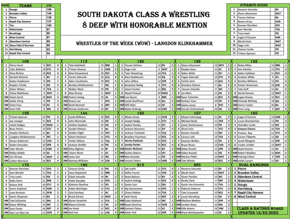 Newest Rankings <a href="https://www.dakotagrappler.com/wp-content/uploads/2023/12/SD-Class-B-Week-4-Ratings.pdf">SD Class B Week-4-Ratings</a> <a href="https://www.dakotagrappler.com/wp-content/uploads/2023/12/Screenshot-2023-12-26-at-3.16.18 PM.png"><img class="[ftmt_id] alignnone wp-image-6881 size-large" src="https://www.dakotagrappler.com/wp-content/uploads/2023/12/Screenshot-2023-12-26-at-3.16.18 PM-1024x774.png" alt="" width="1024" height="774" /></a> <a href="https://www.dakotagrappler.com/wp-content/uploads/2023/12/SD-Class-A-Week-4-2023-2024.pdf">SD Class A Week-4-2023-2024</a> <a href="https://www.dakotagrappler.com/wp-content/uploads/2023/12/Screenshot-2023-12-26-at-3.17.48 PM.png"><img class="[ftmt_id] alignnone wp-image-6883 size-large" src="https://www.dakotagrappler.com/wp-content/uploads/2023/12/Screenshot-2023-12-26-at-3.17.48 PM-1024x778.png" alt="" width="1024" height="778" /></a> <a href="https://www.dakotagrappler.com/wp-content/uploads/2023/12/SD-Girls-ranking-23-24-week-4.pdf">SD Girls ranking-23-24-week-4</a> <a href="https://www.dakotagrappler.com/wp-content/uploads/2023/12/Screenshot-2023-12-26-at-3.21.25 PM.png"><img class="[ftmt_id] alignnone wp-image-6885 size-large" src="https://www.dakotagrappler.com/wp-content/uploads/2023/12/Screenshot-2023-12-26-at-3.21.25 PM-1024x685.png" alt="" width="1024" height="685" /></a>